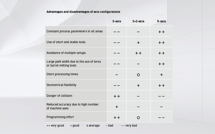 Los motivos indicados en el estudio por la sorprendentemente baja prevalencia del fresado de 5 ejes son obvios. Por un lado, una grande parte de las piezas de trabajo producidas no requieren necesariamente un mecanizado simultáneo de 5 ejes. Por el otro, la baja prevalencia del mecanizado de 5 ejes puede justificarse por las mayores dificultades que deben afrontar las empresas usuarias, especialmente en lo tocante a la programación. No obstante, precisamente en estos dos aspectos, la interacción de la innovación y la evolución están jugando a favor del fresado de 5 ejes.