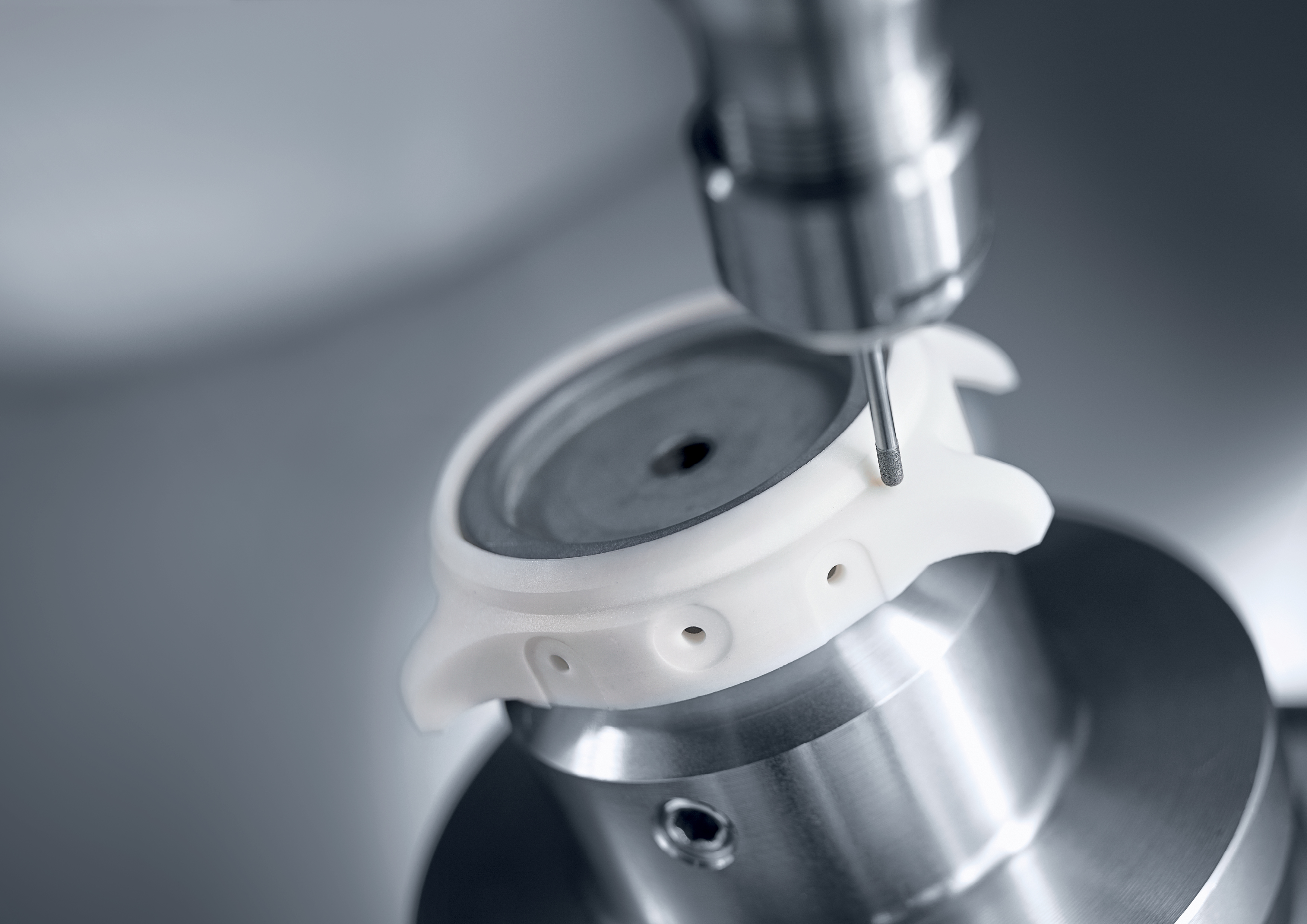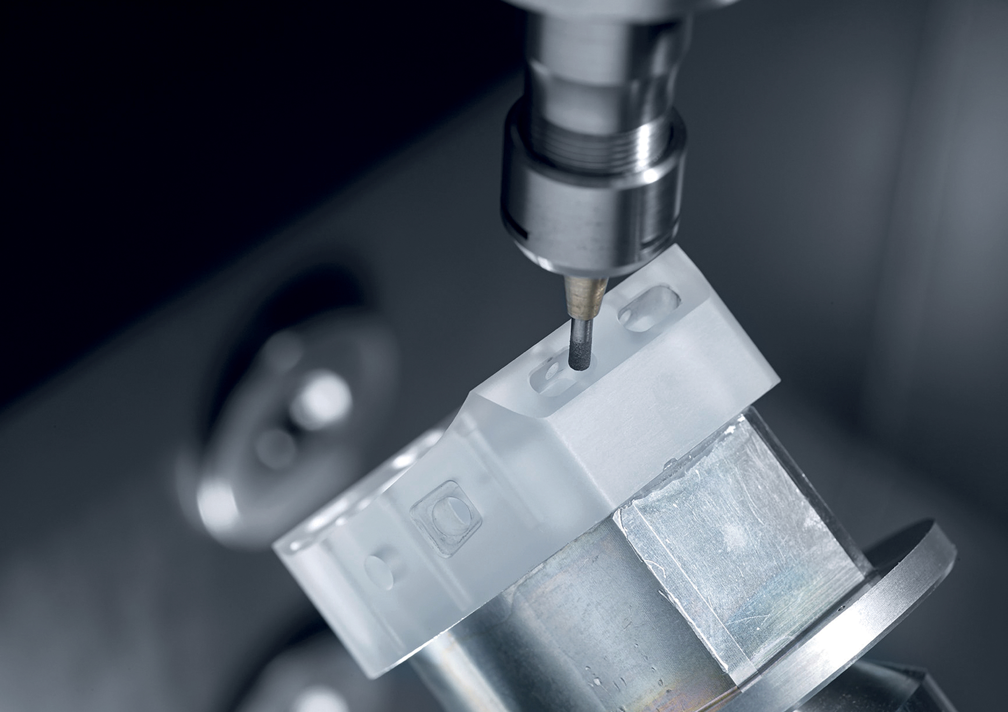 The new DMU 20 linear and the ULTRASONIC 20 linear 3. Generation as a variant for ultrasonic-supported grinding prove once again that DMG MORI also continues to develop proven technologies with a high degree of innovative strength. The machine tool manufacturer has completely revised the world premiere with the experience gained from 600 installed predecessor models and entered a new sphere of positioning accuracy. 3 µm in the linear axes and 3" in the rotary swivel axis surpass even µPrecision technology. Equipped with ULTRASONIC technology, the most precise 5-axis simultaneous machining center from DMG MORI revolutionizes ultrasonic-supported milling and (optional) grinding of advanced materials such as glass, ceramics and demanding composite materials, for example in the semiconductor industry. The ultrasonic superimposition of the tool rotation with amplitudes of up to 15 µm reduces process forces by 50 percent and enables higher feed rates, improved surface finishes and longer tool life as required.